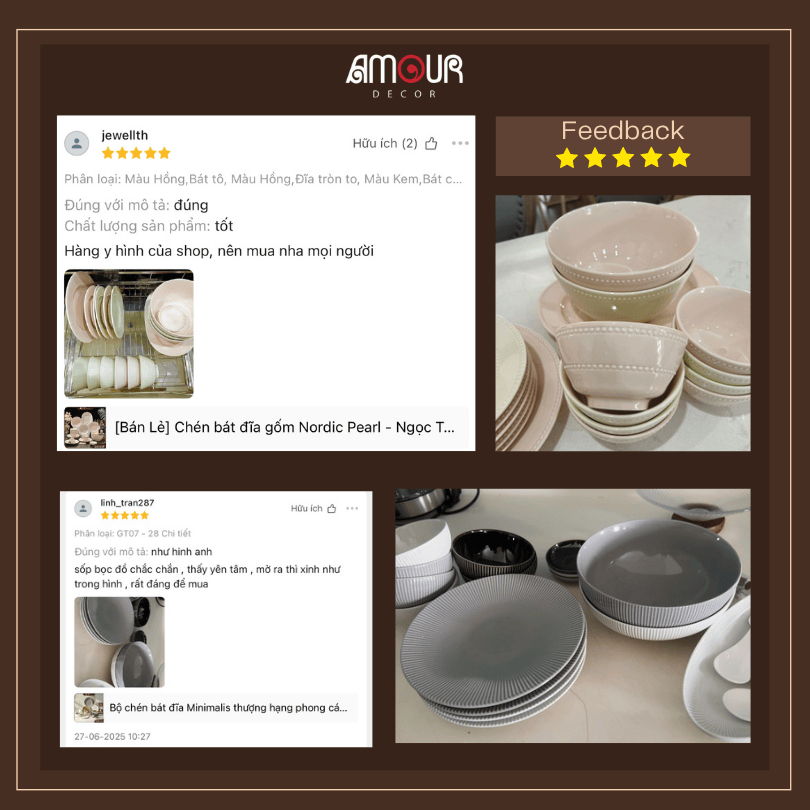 Amour Decor tin rằng: mỗi chiếc bát, chiếc đĩa không chỉ để dùng, mà còn để cảm. Cảm sự chỉn chu, cảm xúc gắn kết, và cả phong cách sống của chính bạn. Chúng tôi hướng đến việc tạo ra những sản phẩm gốm sứ mang tính cá nhân hóa cao – phù hợp với nhiều gu thẩm mỹ, không gian sống, đồng thời bắt nhịp xu hướng trẻ nhưng vẫn giữ được chất thủ công và hồn gốm truyền thống.